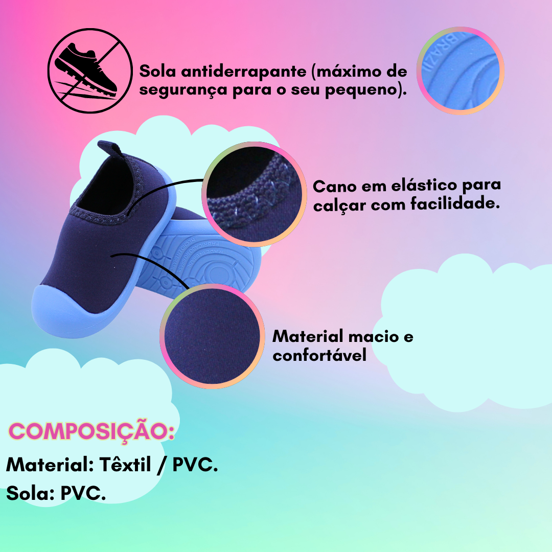 Esse calçado foi desenvolvido especialmente para acompanhar os primeiros passos e as aventuras do dia a dia das crianças. Feito em neoprene macio e flexível, ele se adapta perfeitamente ao pezinho, proporcionando conforto e liberdade de movimento.