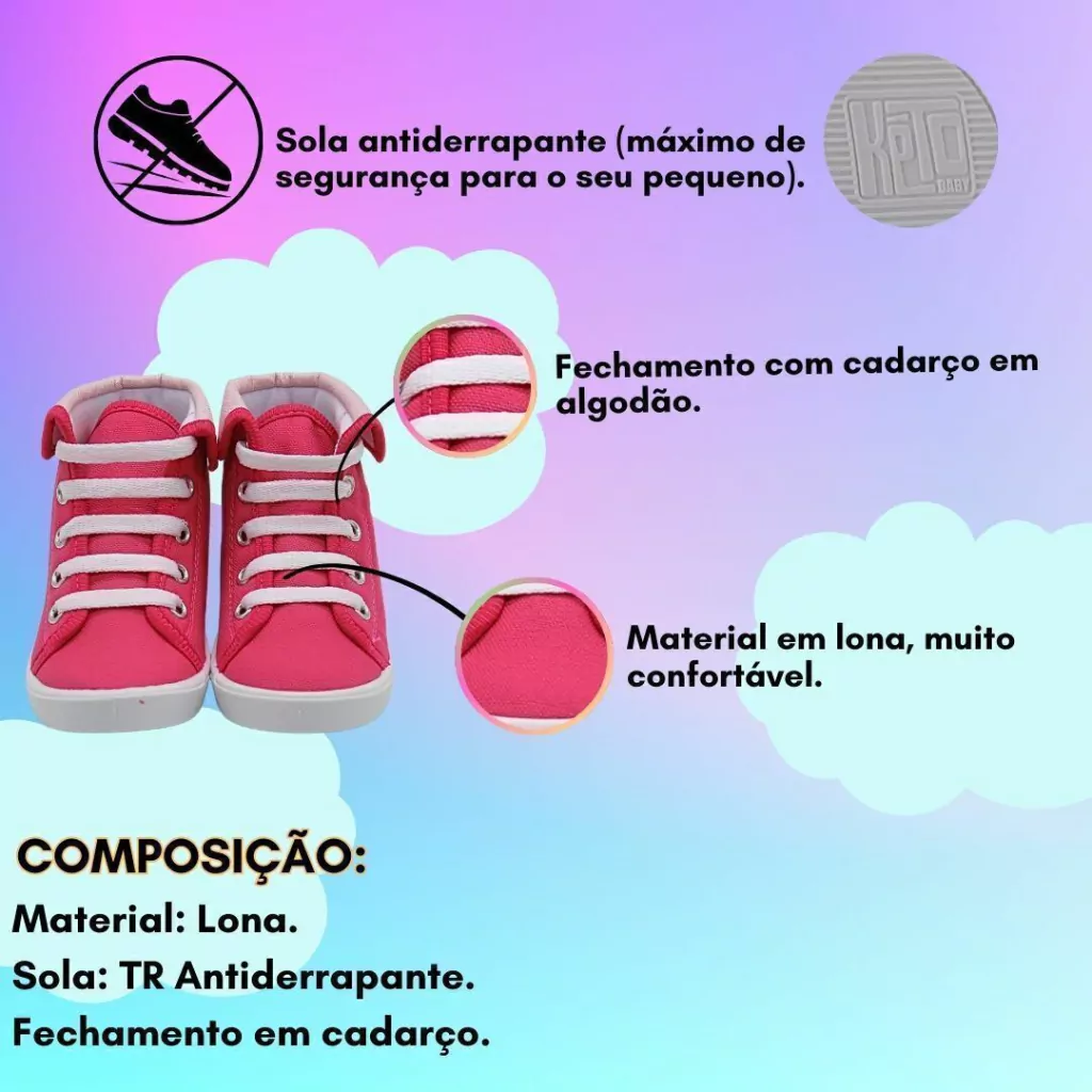 Este tênis é perfeito para meninos e meninas que querem estar na moda. Com seu design de botinha estilo coturno, ele combina facilmente com diferentes looks, tornando-se uma peça essencial no guarda-roupa infantil.